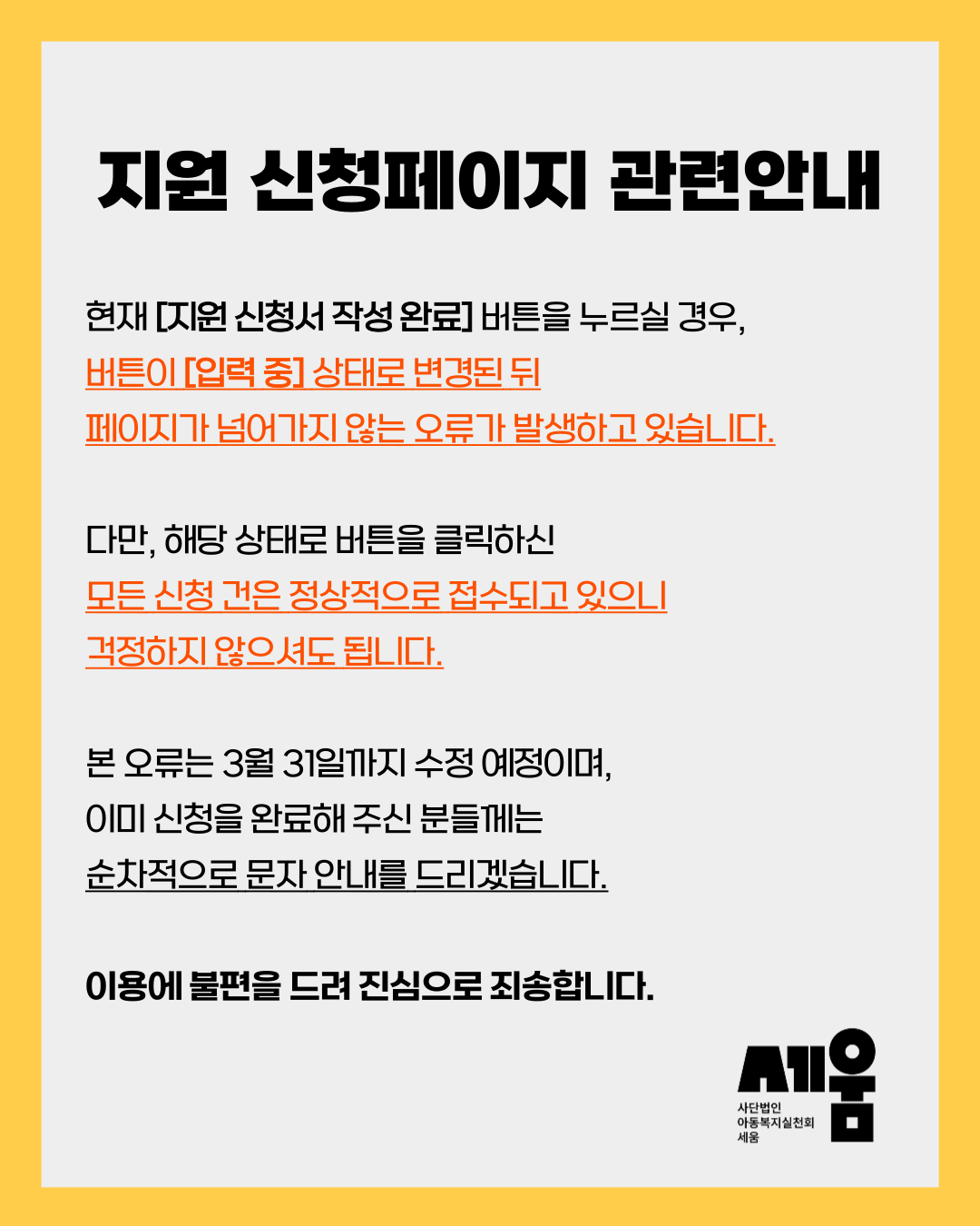 * 신청 시, 입력하신 아동 및 가족, 수용자의 개인정보는 철저히 보호됩니다.