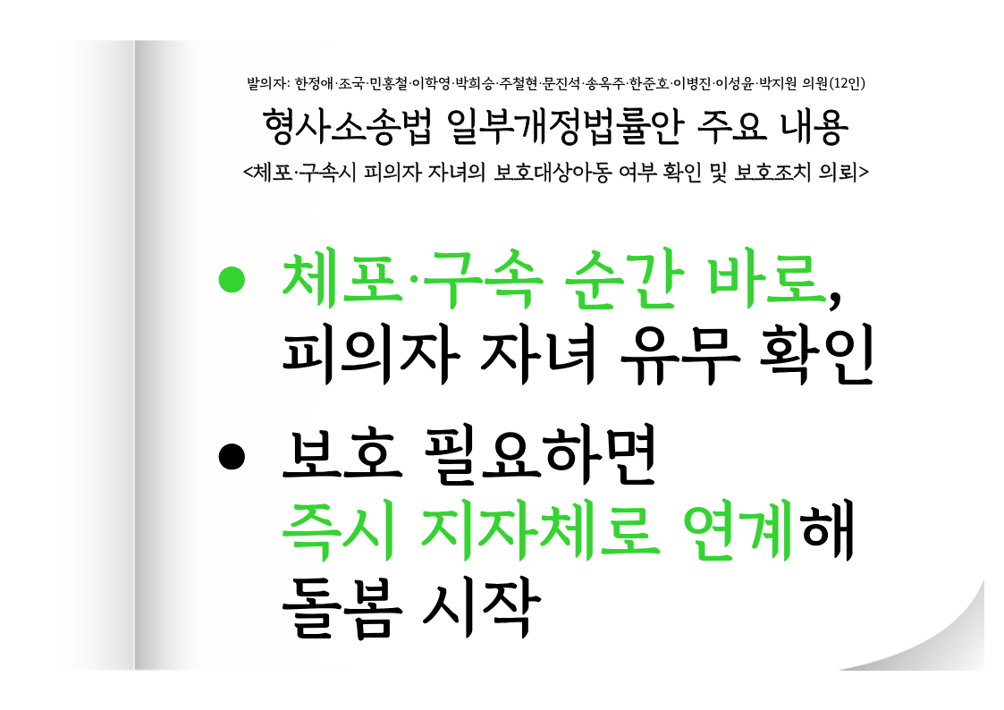 (1) 체포·구속 시 피의자에게 자녀가 있는지를 확인하고, (2) 보호가 필요하다 판단될 시 해당 아동을 보호대상아동으로 지자체에 즉시 의뢰하도록 명시한 법안입니다.